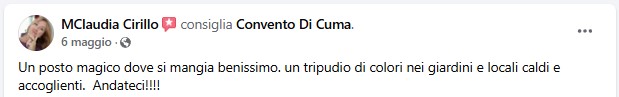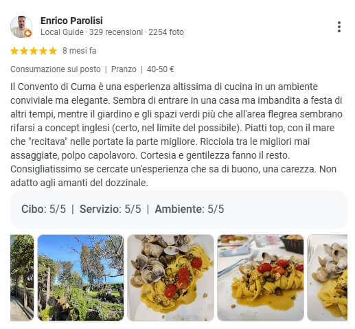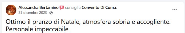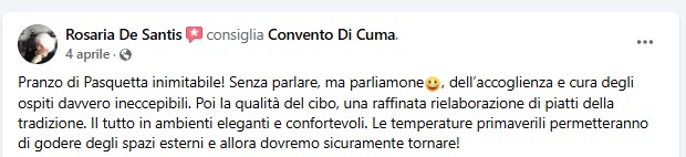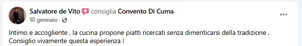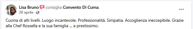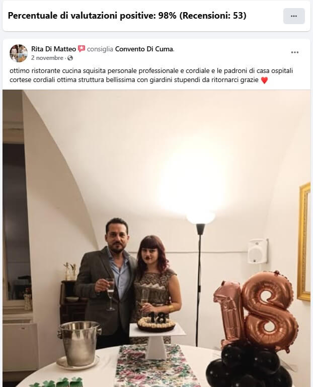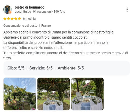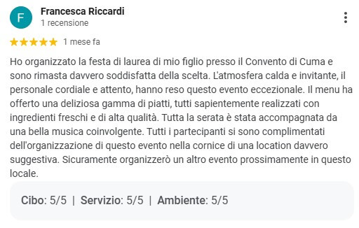 Offri ai tuoi invitati un'esperienza culinaria che non hanno mai provato prima! Organizza qui il tuo prossimo evento e sorprendi tutti con la cucina della nostra Chef Rossella Renino 🍽️❣️ Pacchetto Completo a Buffet Il più scelto per feste di compleanno, lauree e battesimi A partire da 40€ a persona (minimo 50 persone)Torta e bibite incluse CONTATTACI ORA E se invece vuoi un Evento super personalizzato... Qui al Convento di Cuma sarai seguito/a passo dopo passo nell’organizzazione, a partire dagli allestimenti fino al menù, con massima attenzione ai particolari e cura dei dettagli… A partire da 70€ a personaTorta e bibite incluse PARLIAMONE! La nostra Chef Rossella Renino vi aspetta, insieme a Gabriella, per organizzare il vostro prossimo evento speciale... PARLA CON NOI Recensioni dei nostri clienti su Google CONTATTACI CONTATTACI Ecco invece le nostre Recensioni su Facebook CONTATTACI